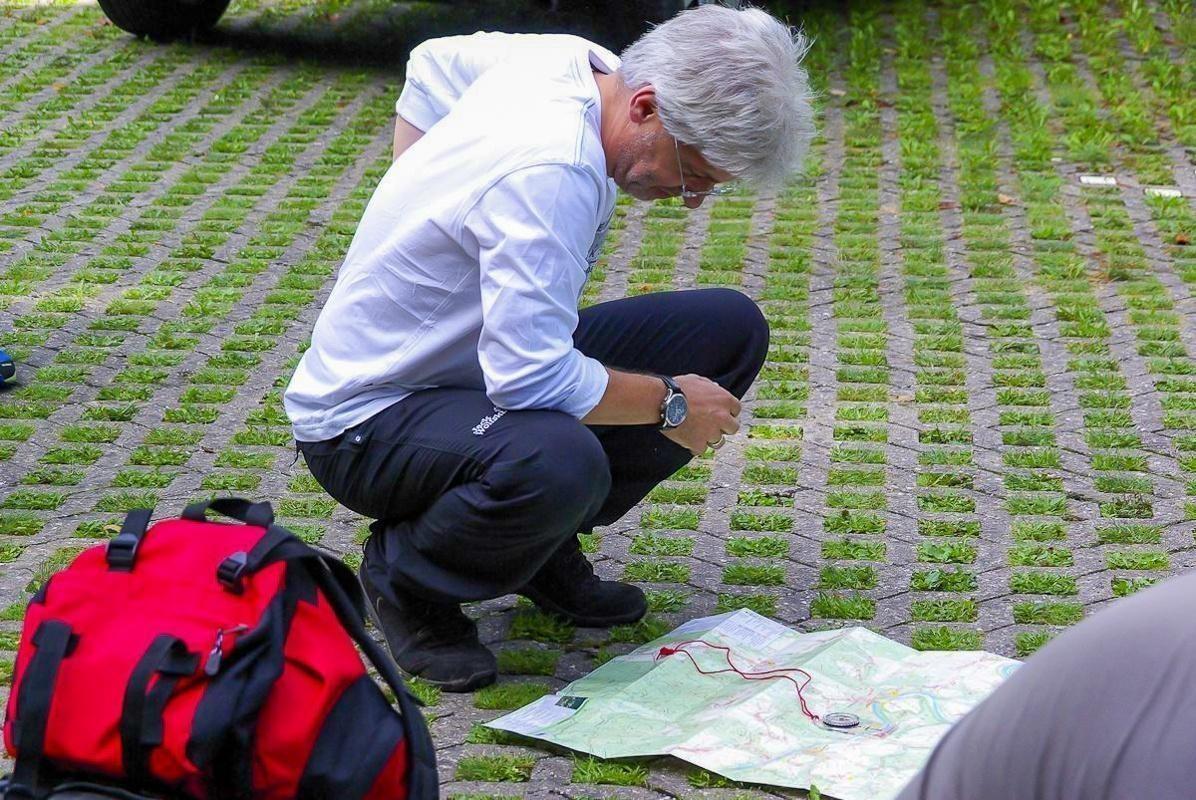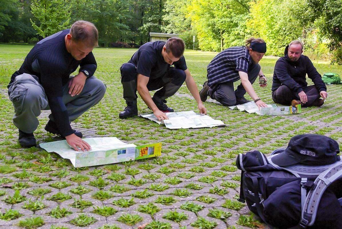 Gruppierung von vier Personen, die Ausrüstung und Karten an einem Parkplatz überprüfen