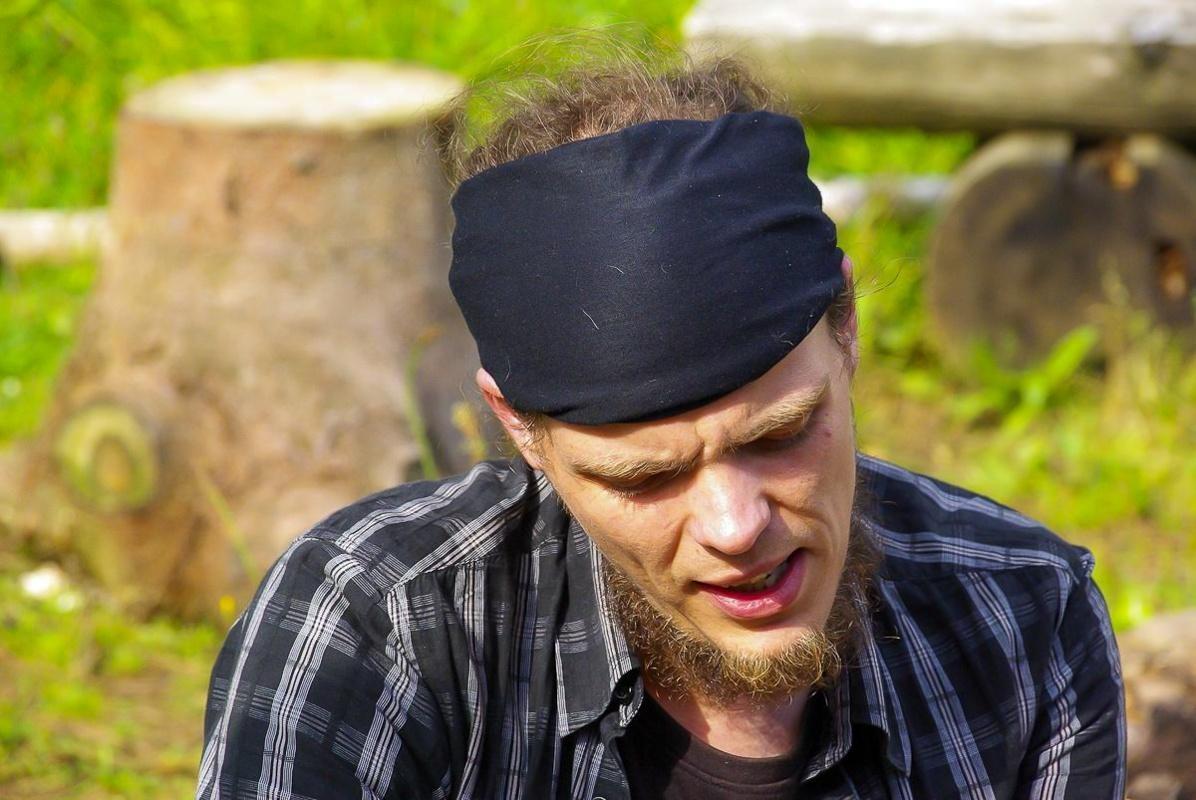 Mann mit schwarzem Stirnband sitzt vor Baumstümpfen und konzentriert sich