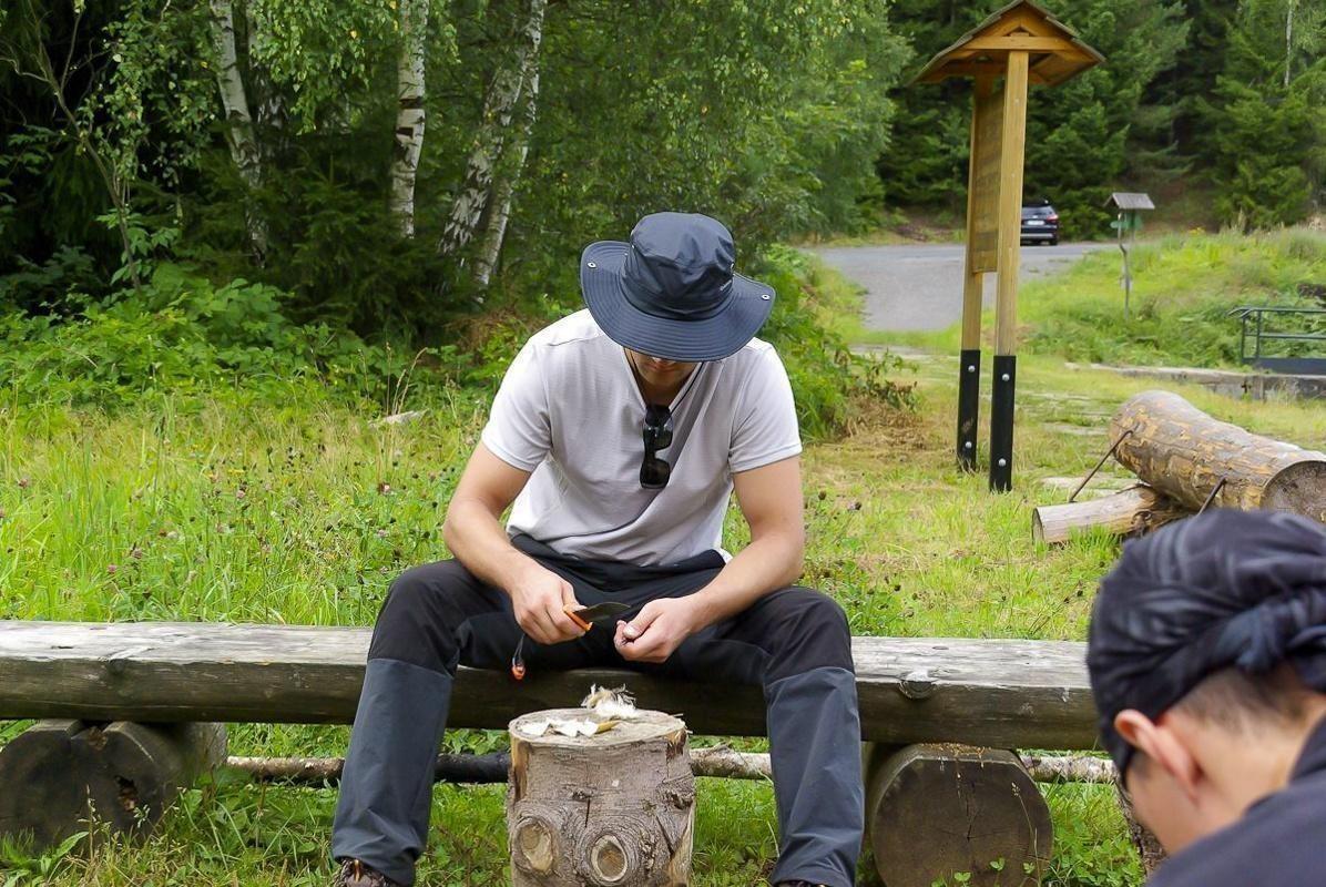 Mann sitzt auf Baumstumpf und bearbeitet Holzstück mit Messer