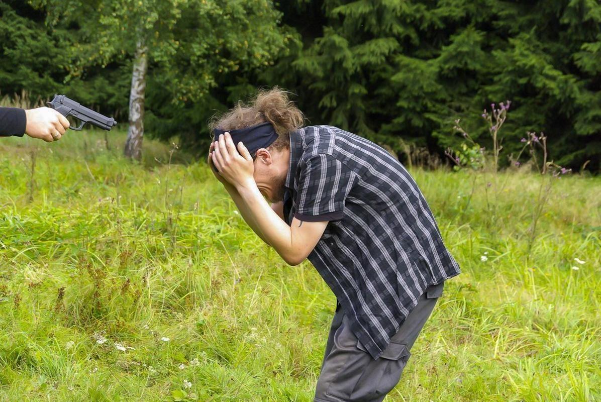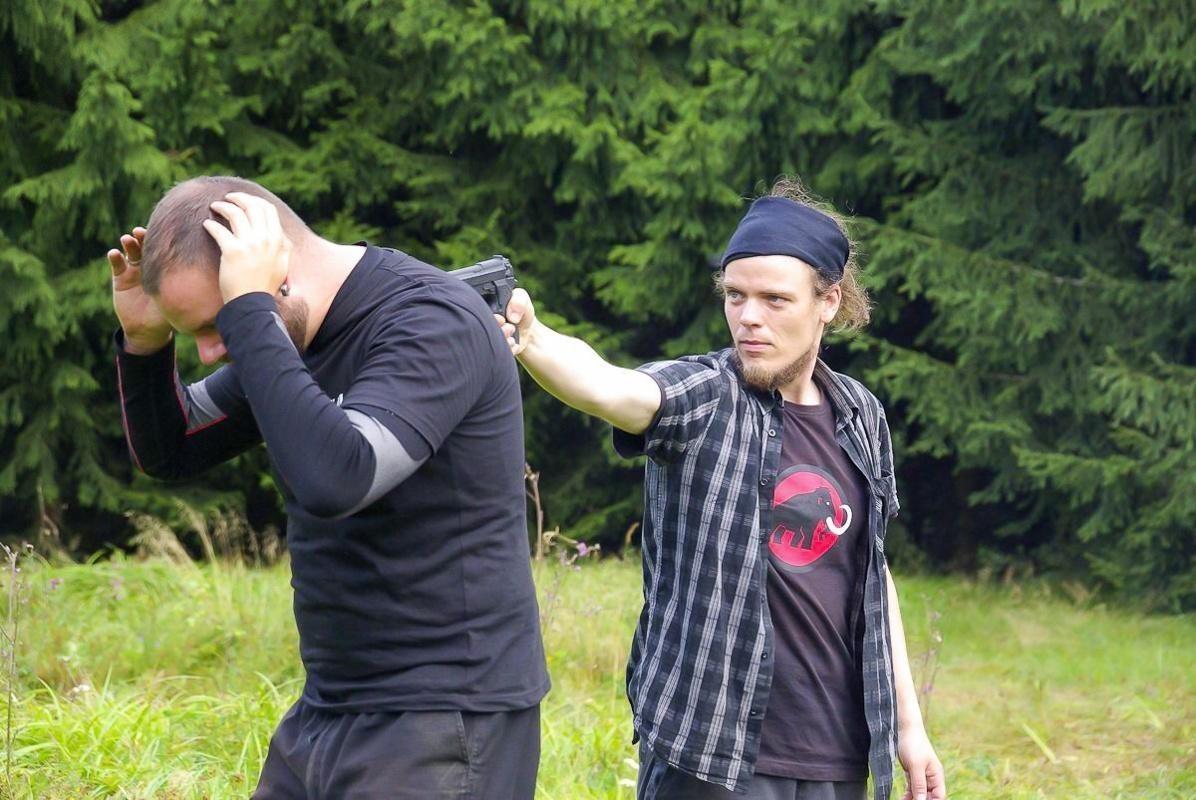 Zwei Personen in einem Wald, eine hält eine Waffe an den Kopf der anderen