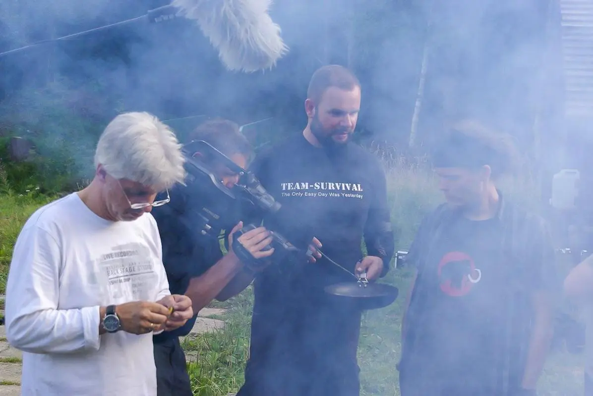 Rauch umgibt mehrere Personen, während eine Kamera auf eine Aktion gerichtet ist
