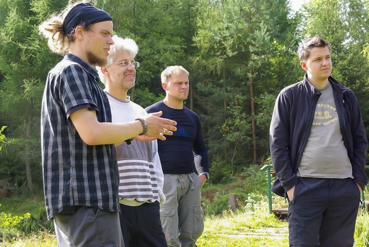 Gruppe von Personen steht um einen Tisch aus Baumstämmen, Kamera wird gehalten