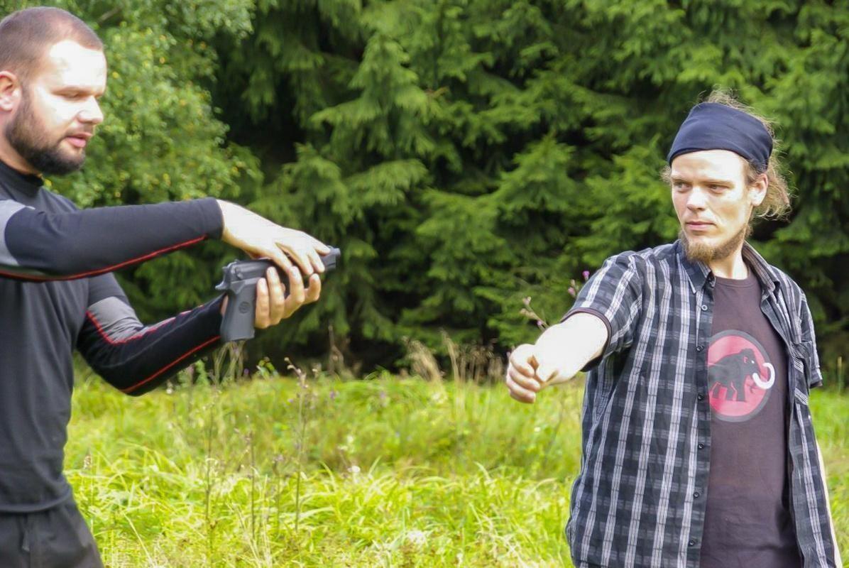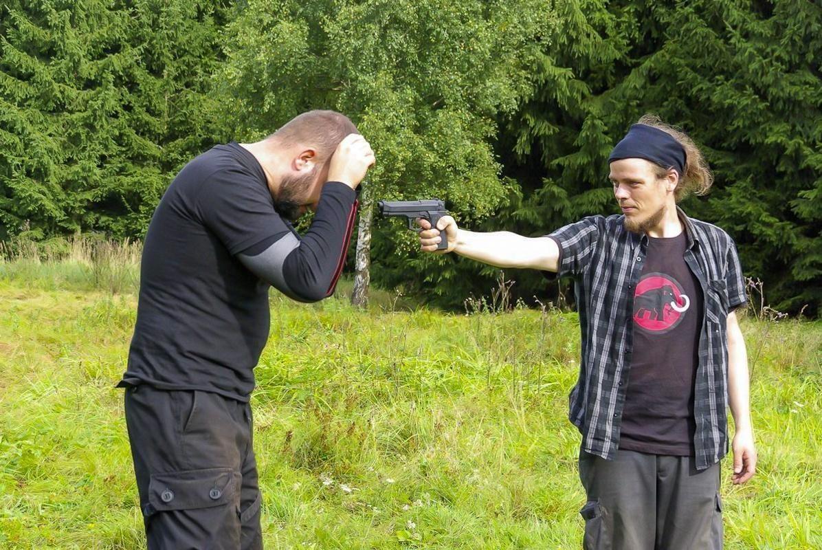Zwei Personen in einer Übungssituation, eine hält eine Pistole, die andere wird geführt