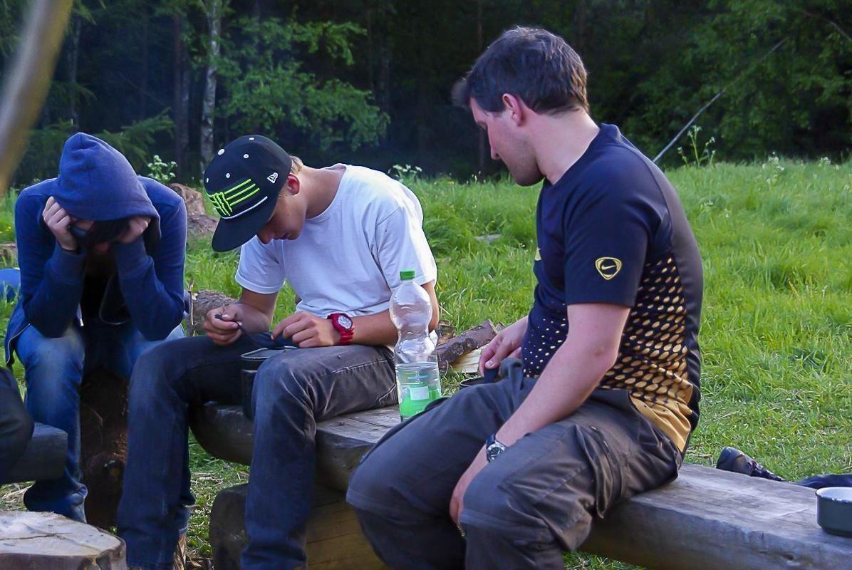 Gruppe sitzt auf Baumstämmen und diskutiert im Freien, Ausrüstung liegt verstreut