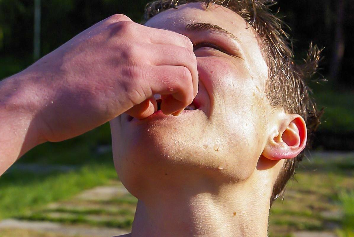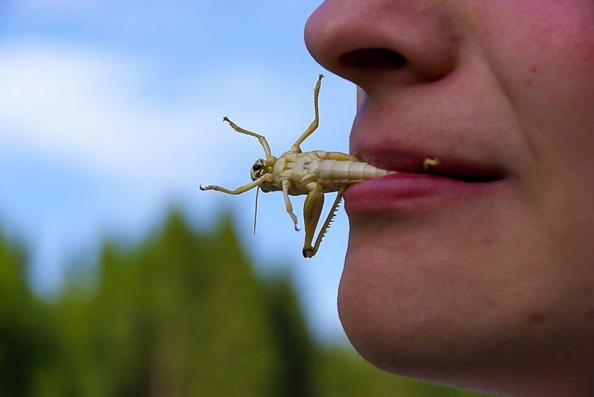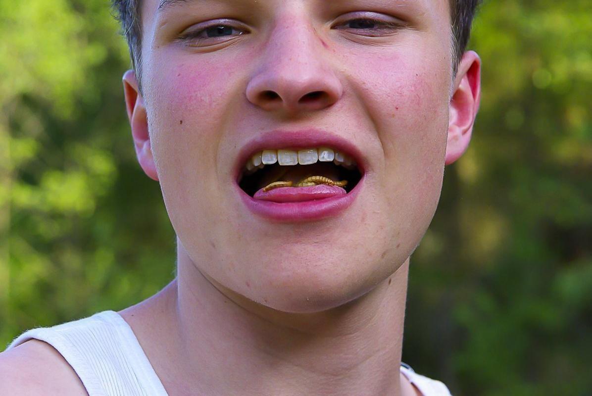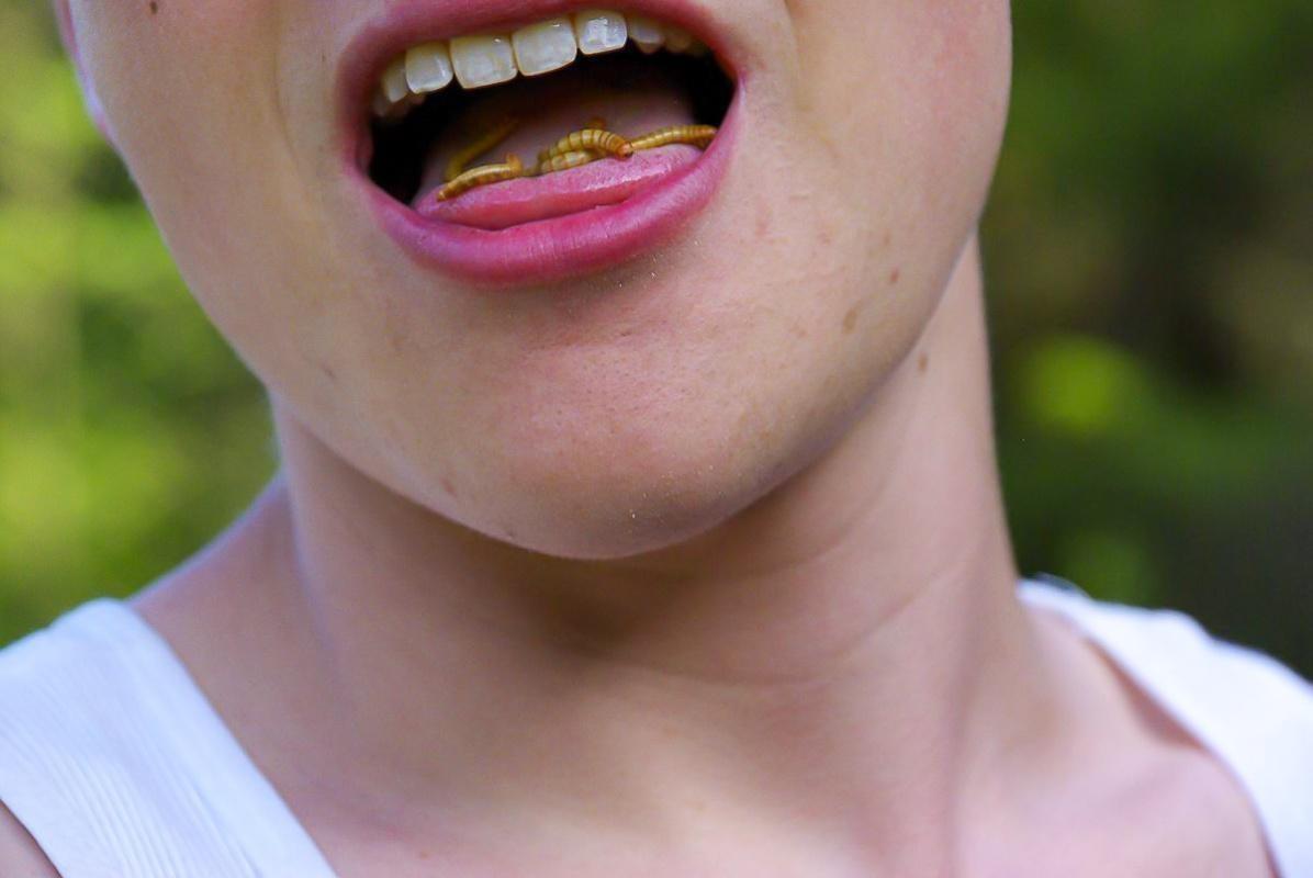 Mund mit Insekten gefüllt, Person zeigt herausgestreckte Zunge