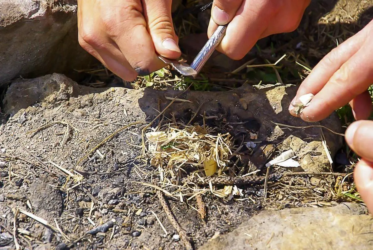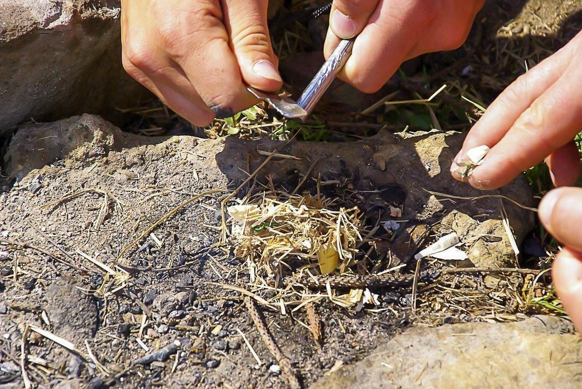 Zunder wird mit einem Messer bearbeitet, um Funken zu erzeugen