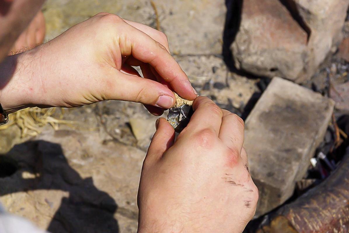 Drei Personen sitzen um einen Steinhaufen und bearbeiten ein Werkzeug
