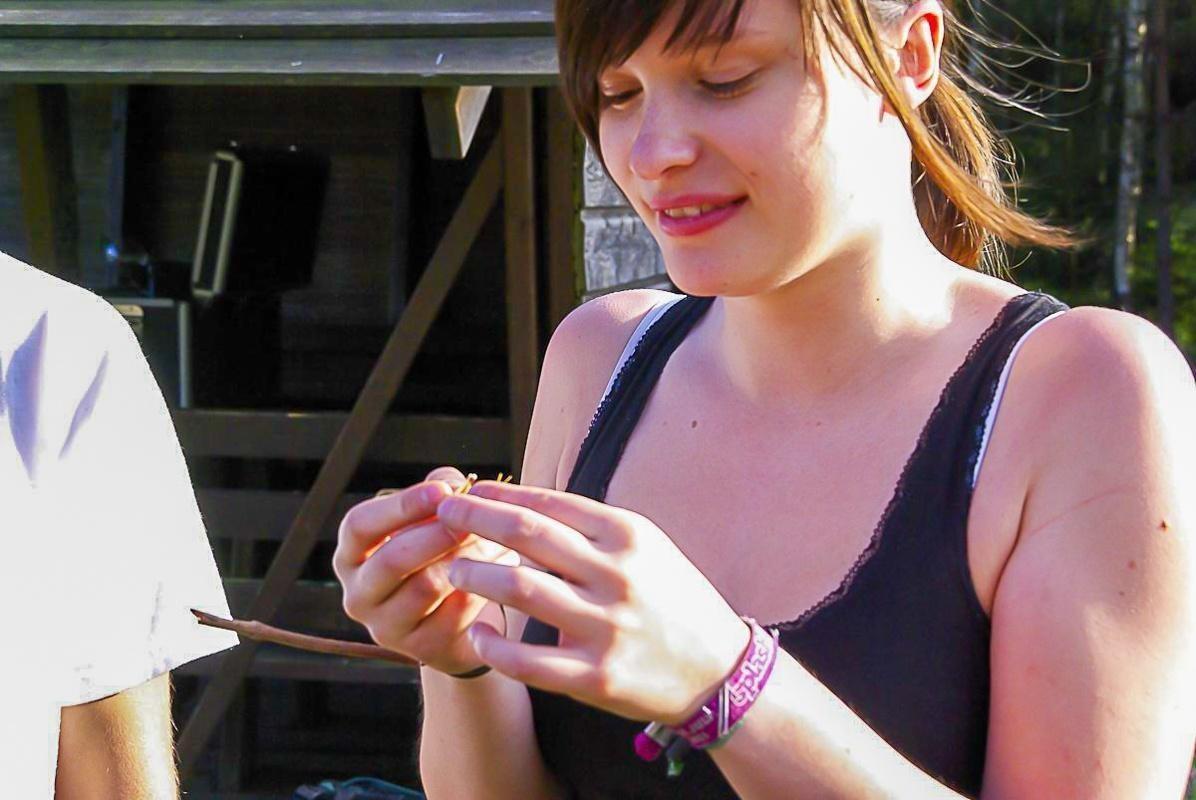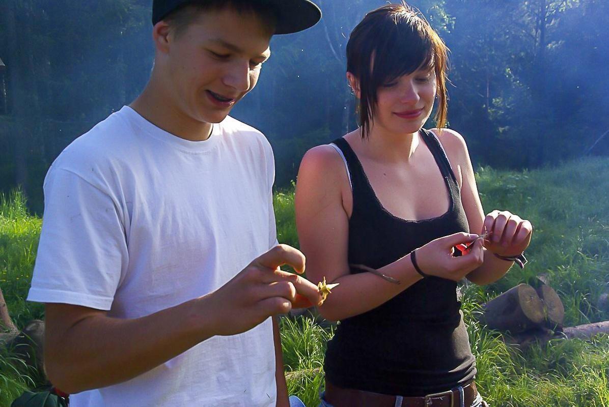 Zwei Personen halten kleine Gegenstände in den Händen, umgeben von grüner Wiese und Bäumen