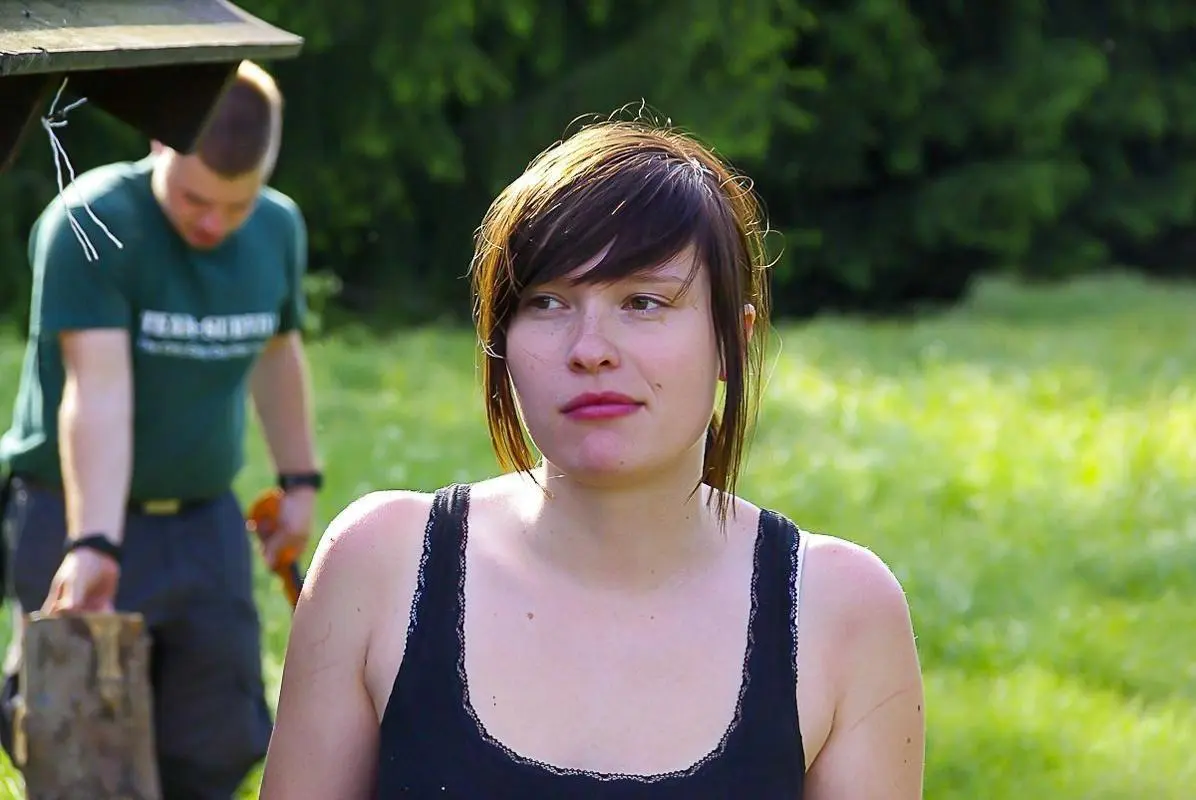 Zwei Personen stehen auf einer Wiese, eine hält ein Messer in der Hand