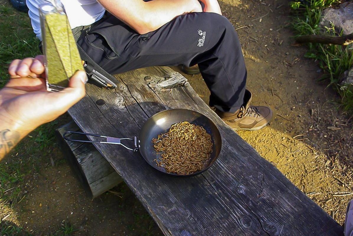 Gewürz wird über eine Pfanne mit Insekten gestreut, Holzbank im Hintergrund