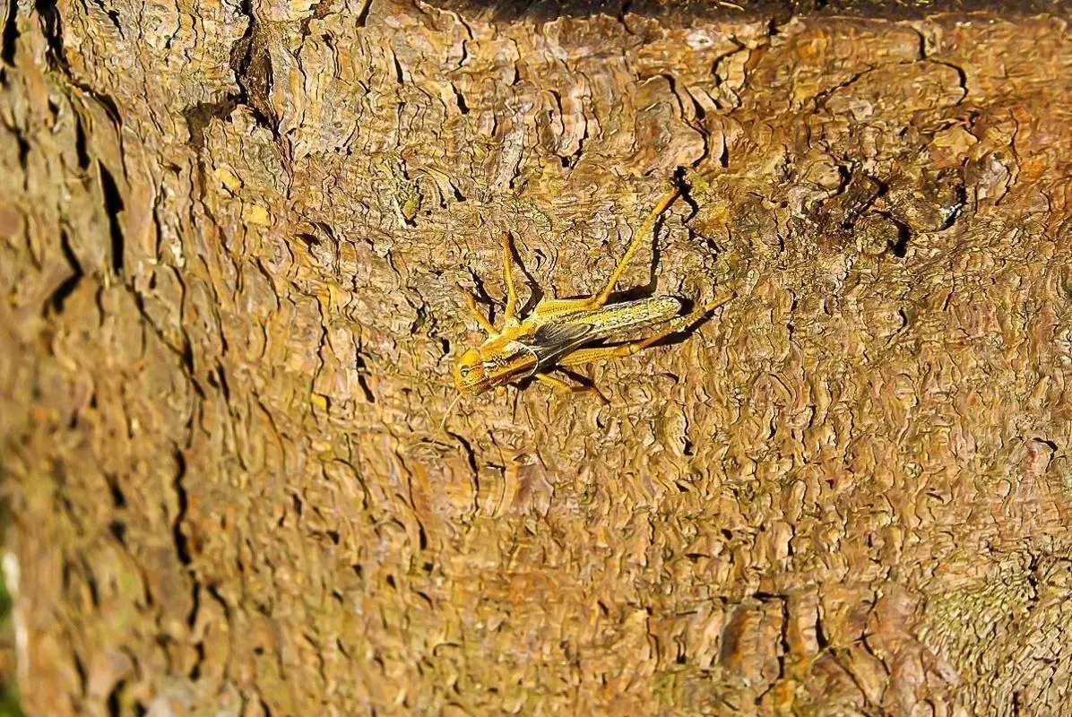 Grashüpfer sitzt auf einer Baumrinde mit rauer Oberfläche