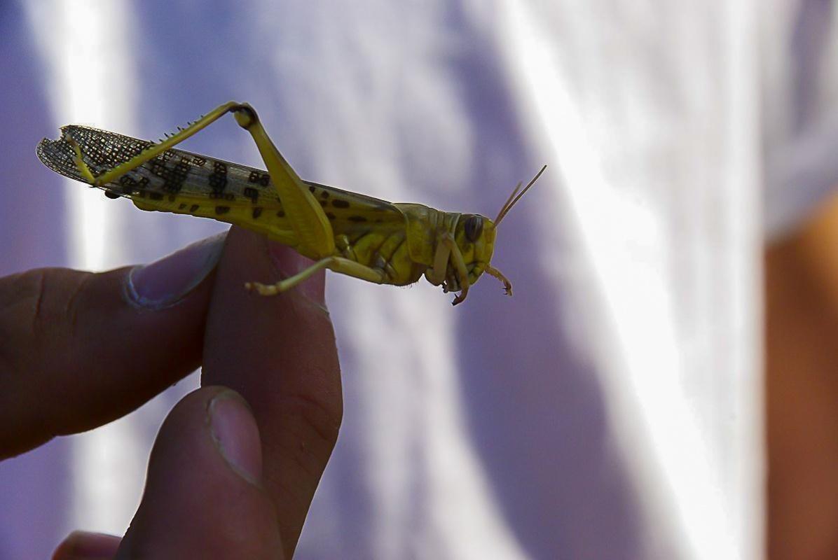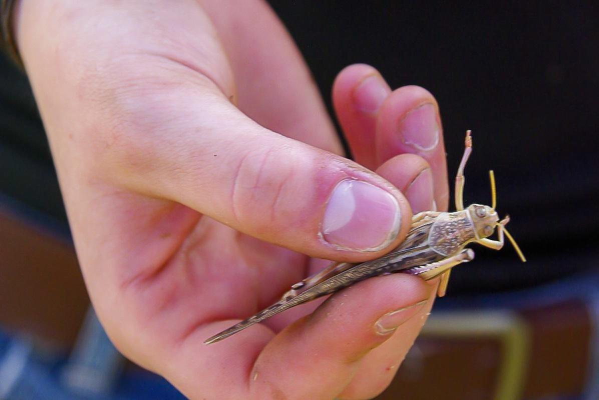 Grashüpfer wird zwischen Daumen und Zeigefinger gehalten