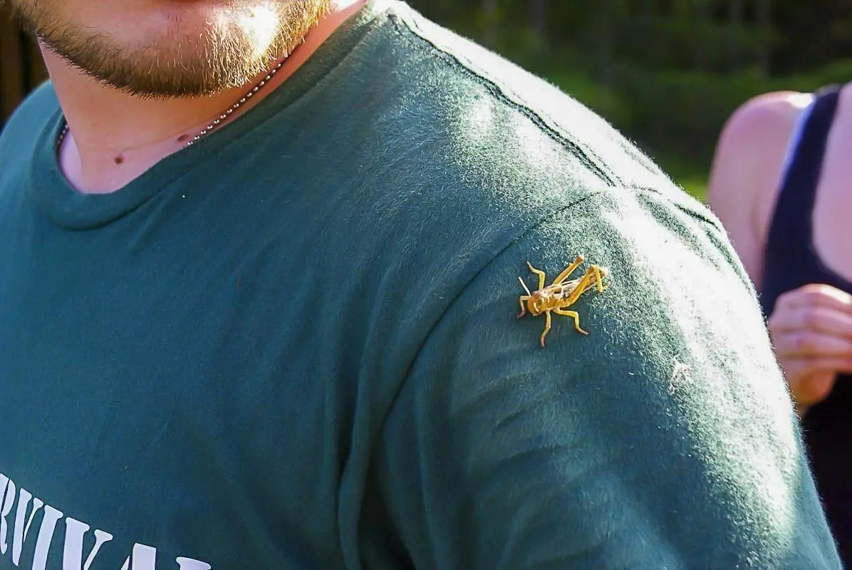 Grashüpfer sitzt auf einem schwarzen T-Shirt in der Natur