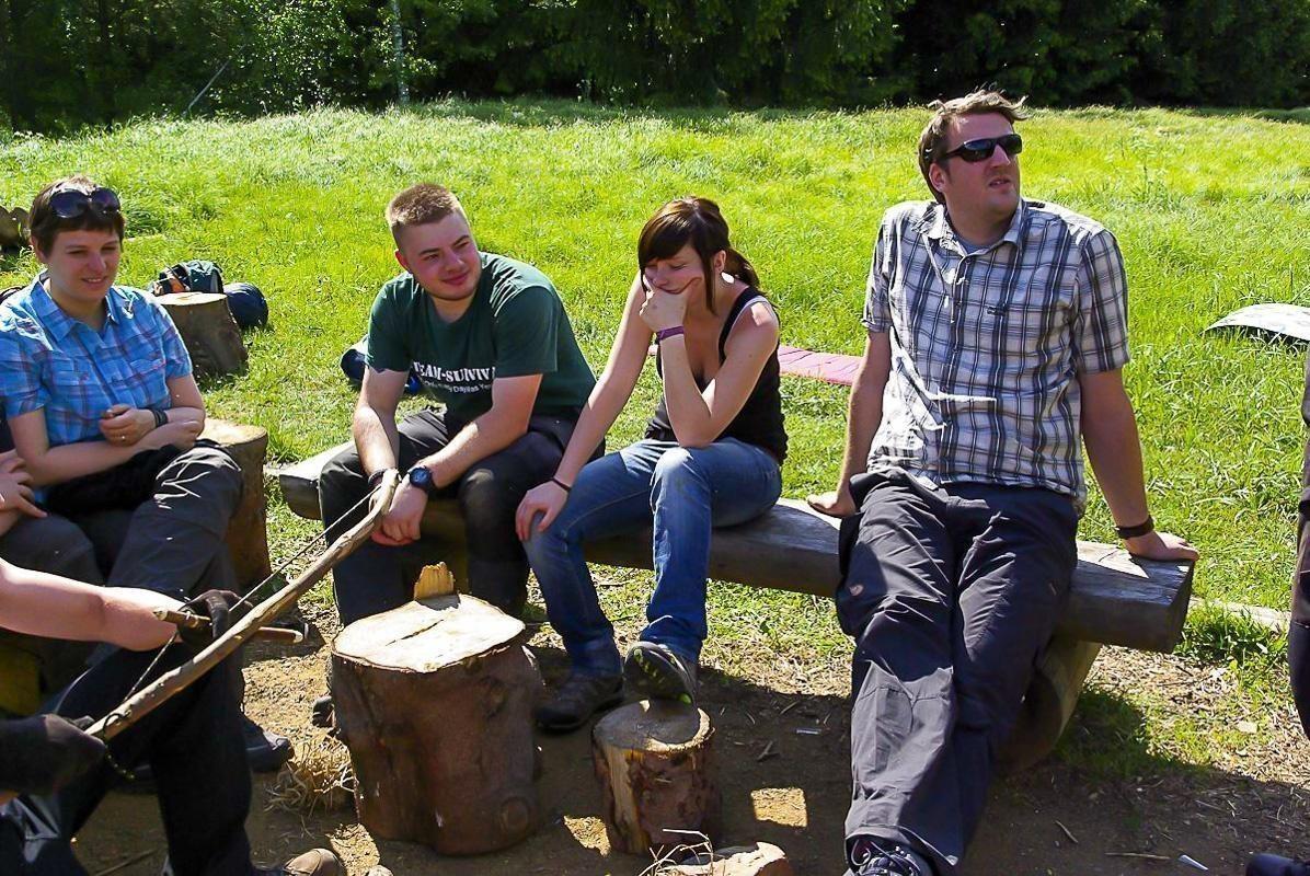 Gruppendynamik während einer Übung im Freien, Teilnehmer interagieren miteinander
