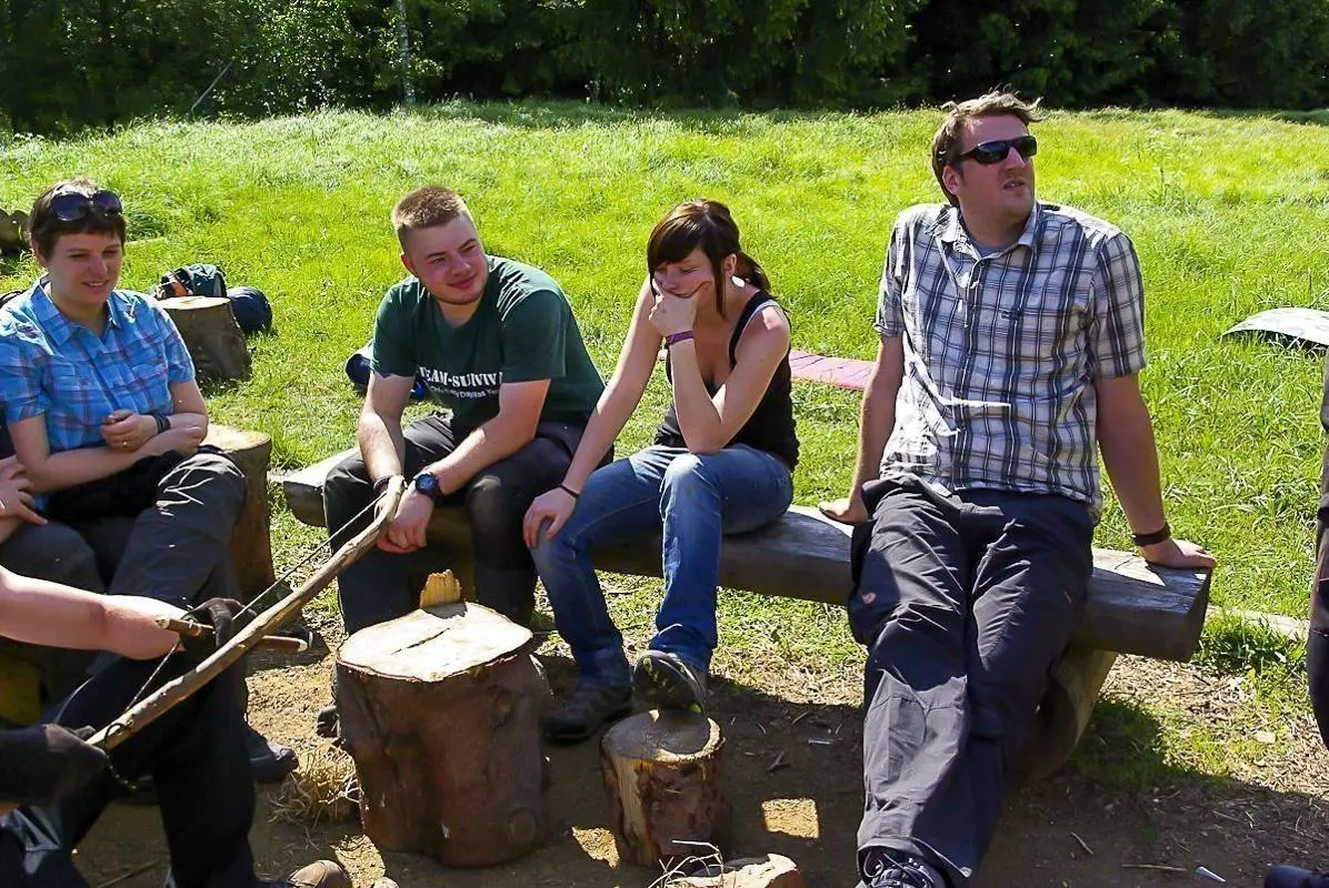 Gruppe sitzt auf Baumstämmen und unterhält sich im Freien