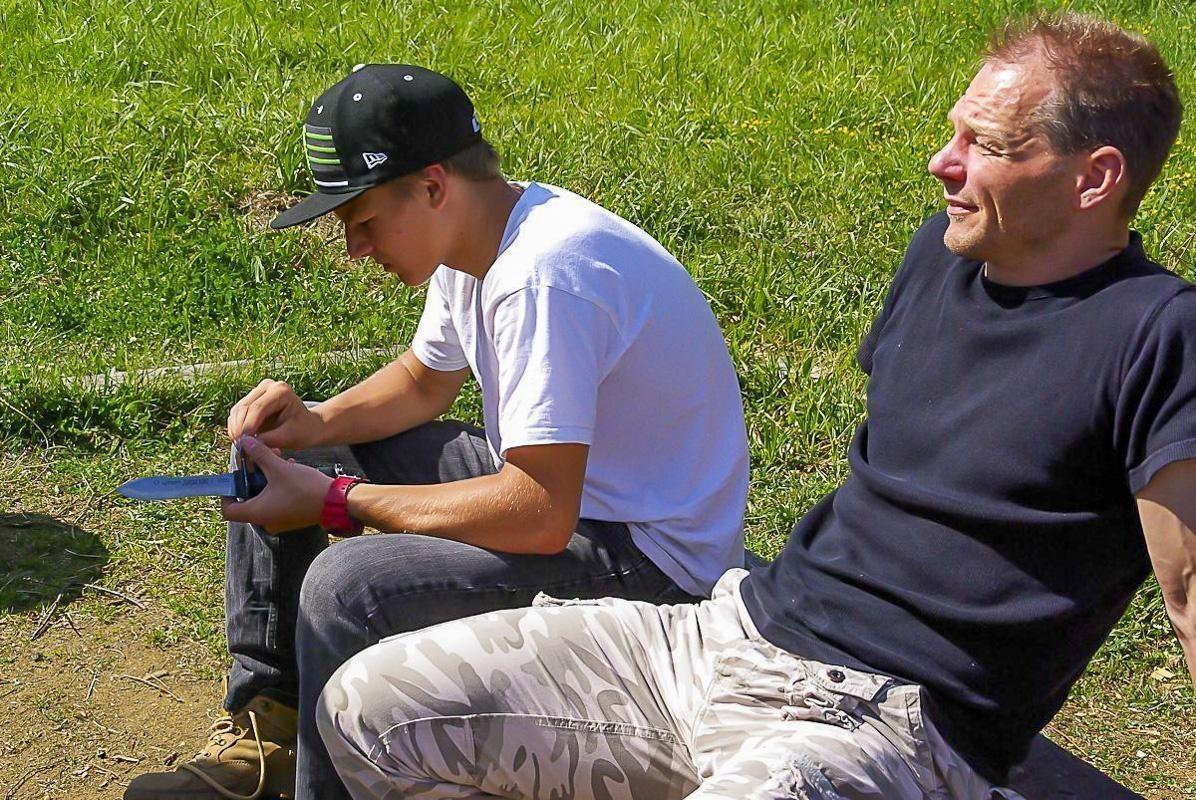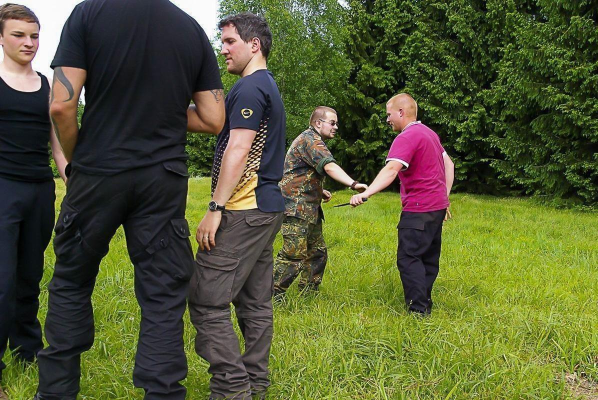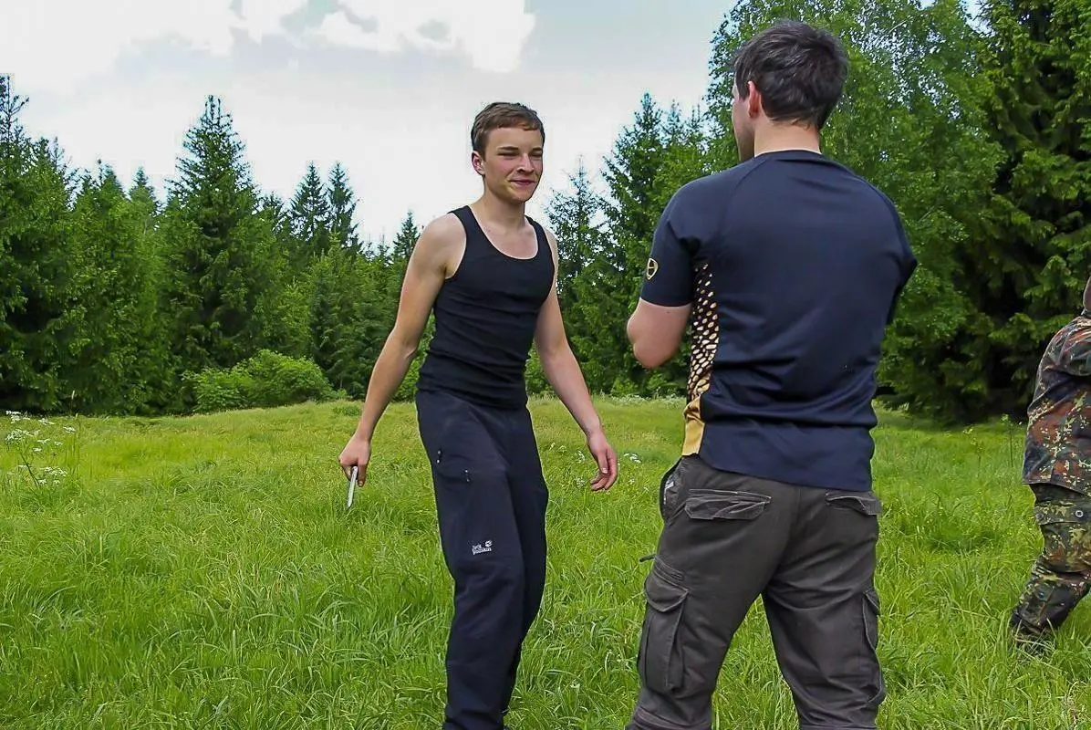 Zwei Personen stehen auf einer Wiese und zeigen eine Technik mit einem Messer