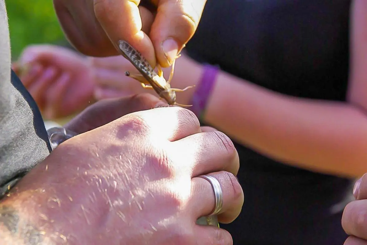 Hände halten eine Heuschrecke, während eine andere Hand sie festhält