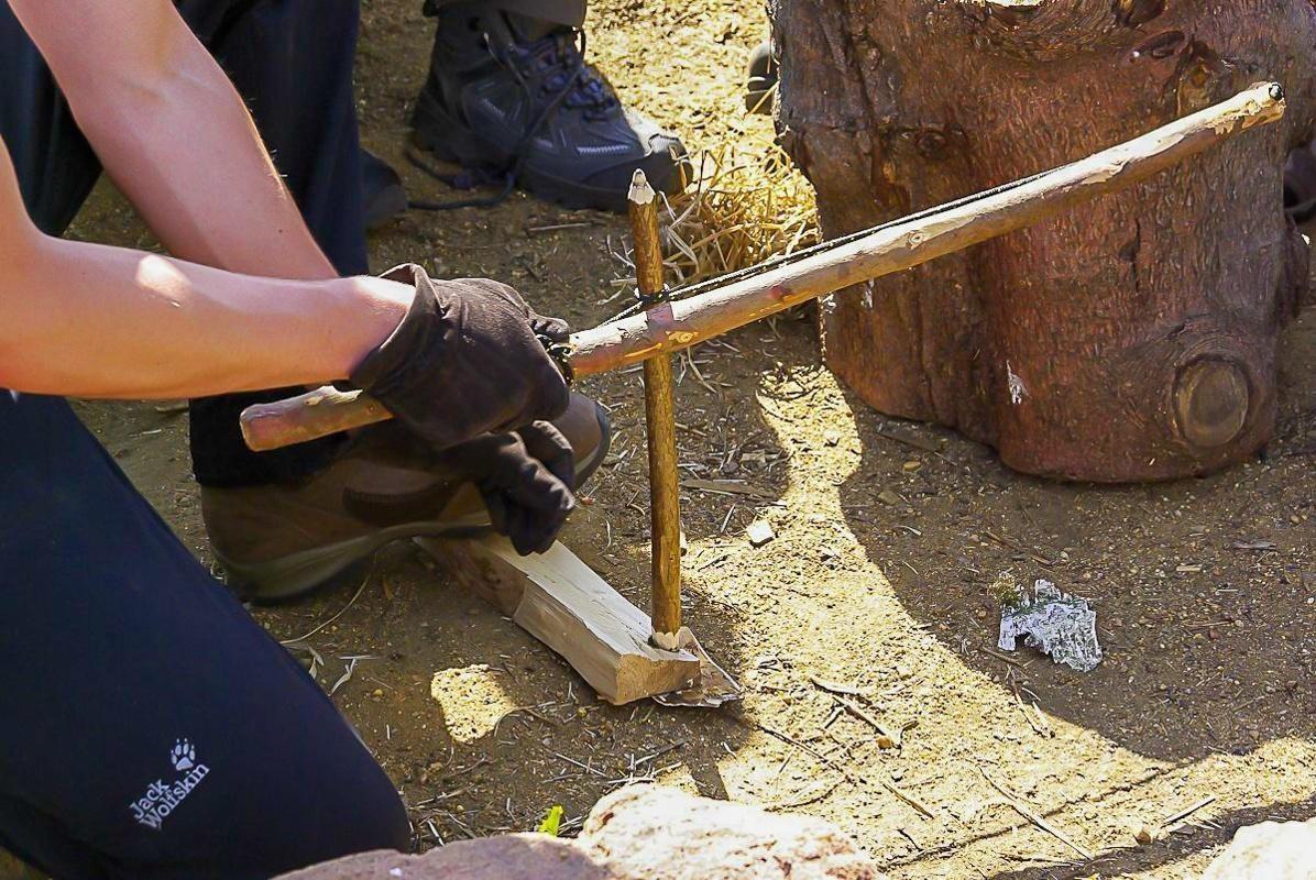 Zunder wird mit einem Feuerbohrer bearbeitet