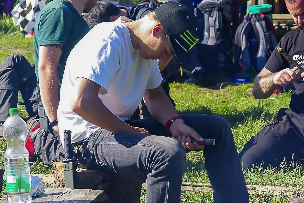 Junger Mann sitzt auf einem Baumstamm und bearbeitet ein Messer