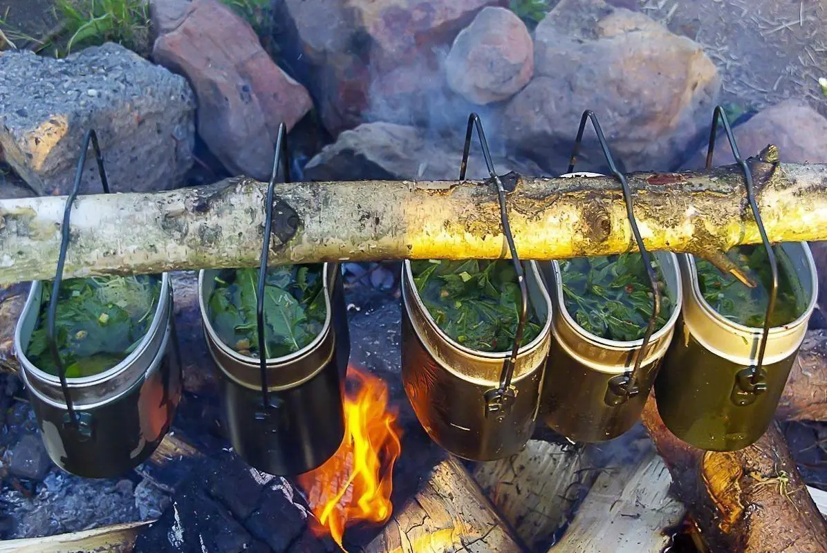 Zwei Kessel mit grünen Nadeln hängen über einem kleinen Feuer