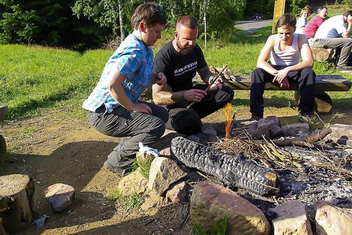 Gruppe übt Feuerentzündung mit Zunder und Funken am Lagerfeuer