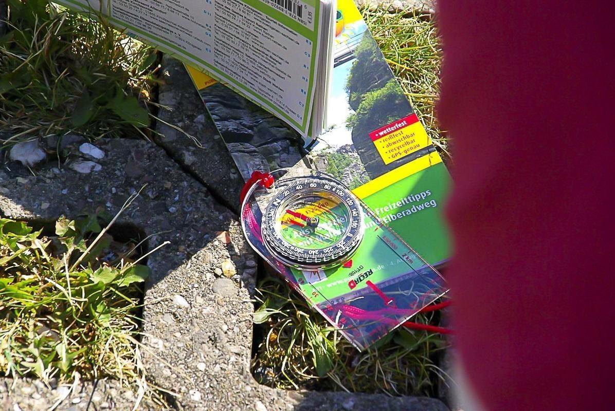 Gruppe betrachtet Karten und diskutiert Orientierungstechniken auf dem Boden