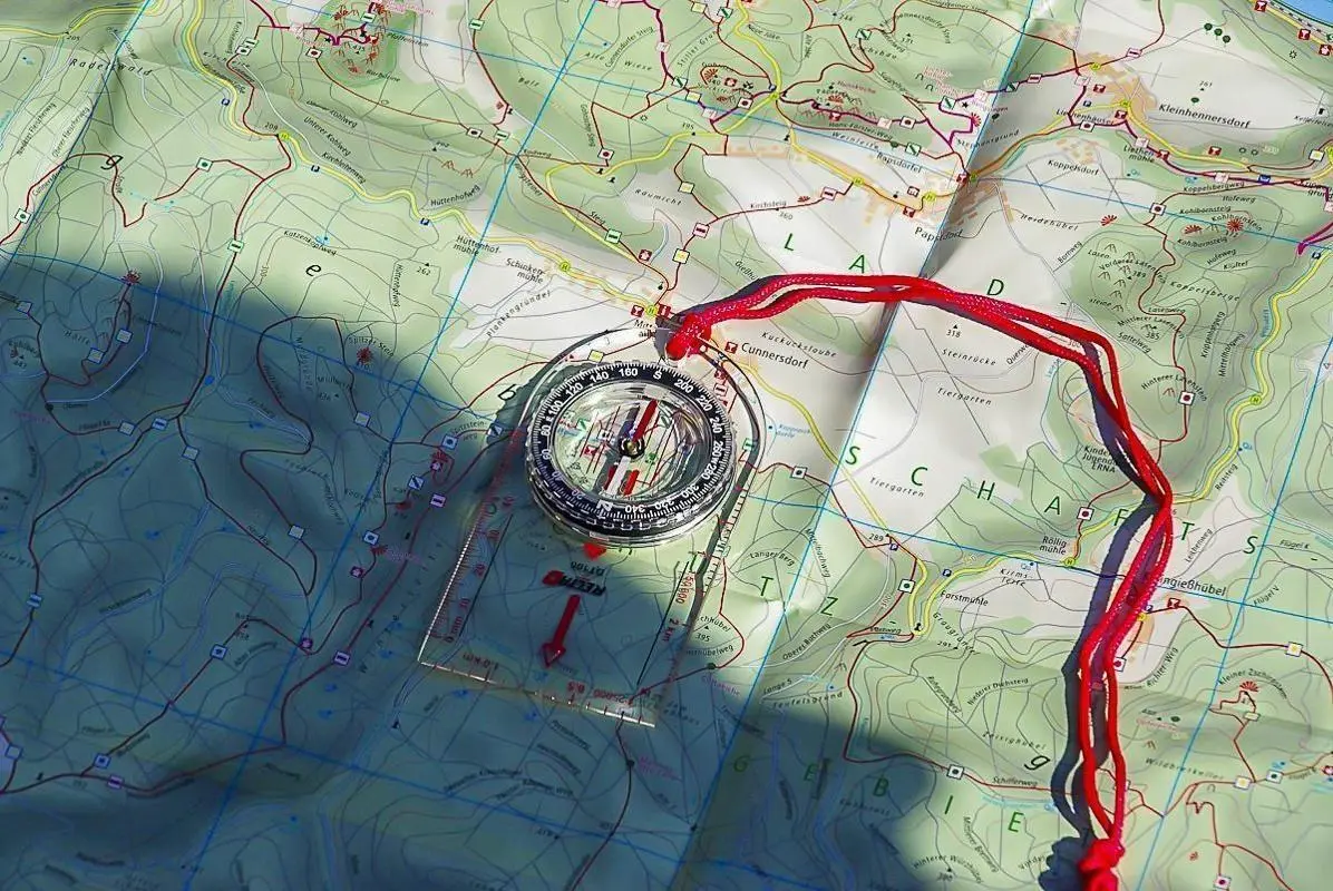 Kompass liegt auf einer topografischen Karte mit Höhenlinien und Markierungen