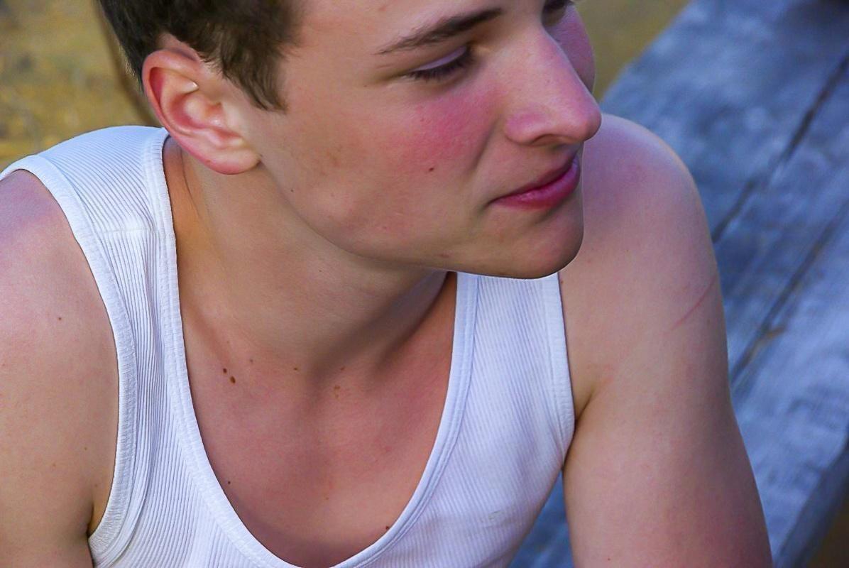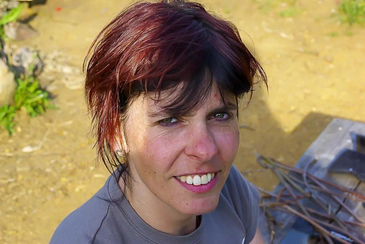 Lächelnde Person mit kurzem, rotem Haar sitzt auf dem Boden neben Holzstücken