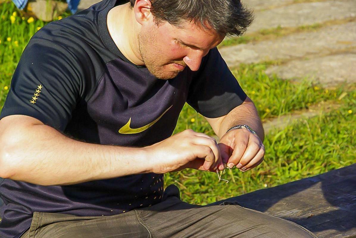 Mann bindet eine Schnur an einen Haken auf einem Holzstück