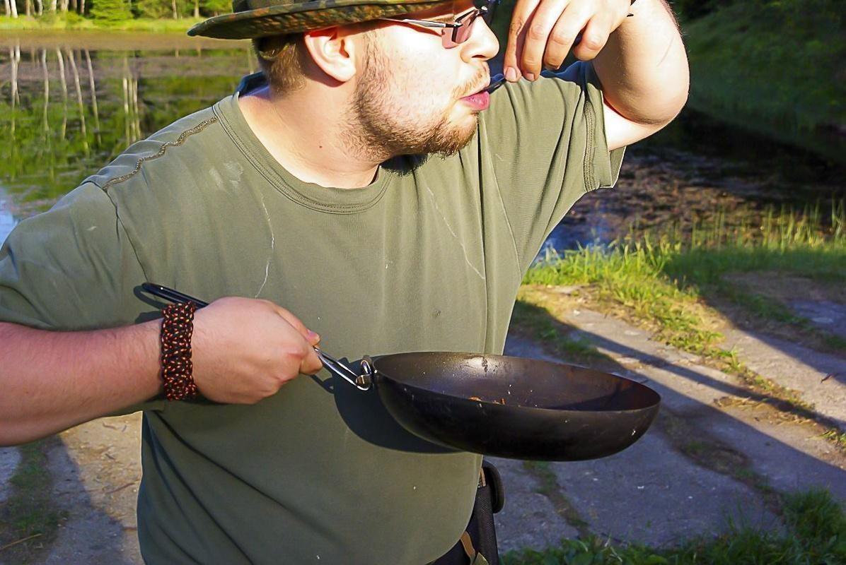 Mann hält Pfanne und löffelt Inhalt mit einer Gabel