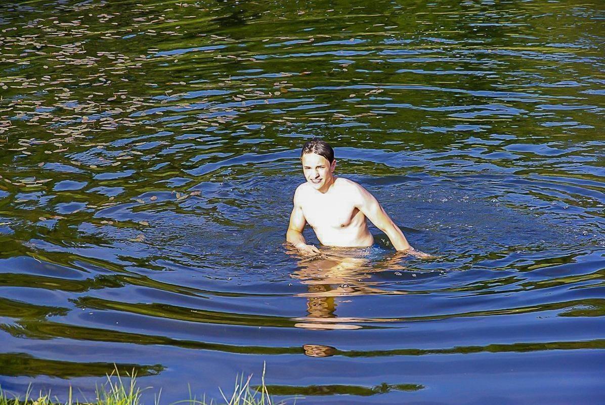 Schwimmende Person erzeugt Wellen im ruhigen Wasser eines Teiches