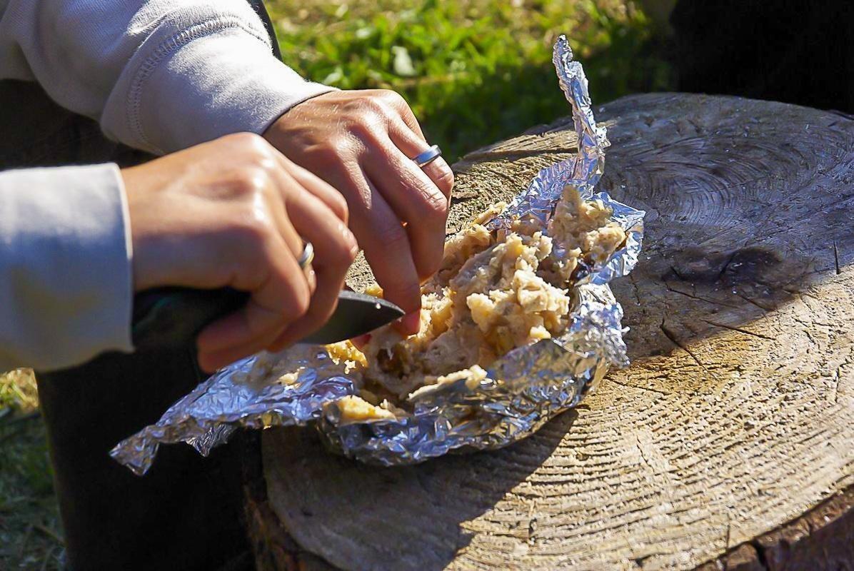 Messer schneidet in Alufolie eingewickeltes Essen auf einem Baumstumpf
