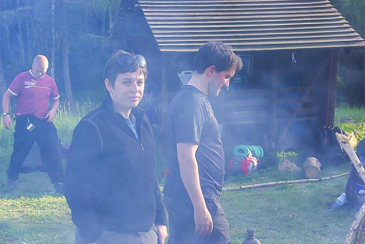 Gruppe steht um ein kleines Bodenfeuer und beobachtet eine improvisierte Konstruktion