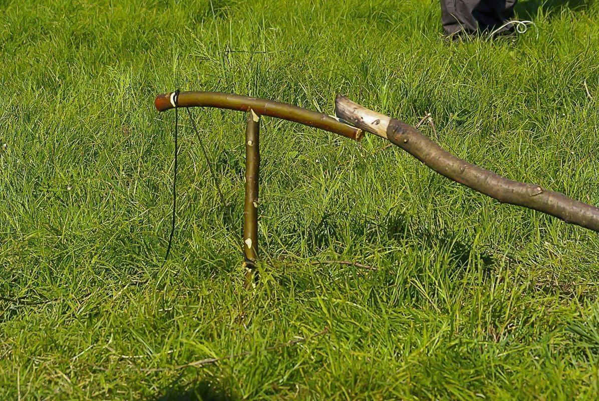 Schlagfalle (Figure-Four) aus Holzstücken im Gras