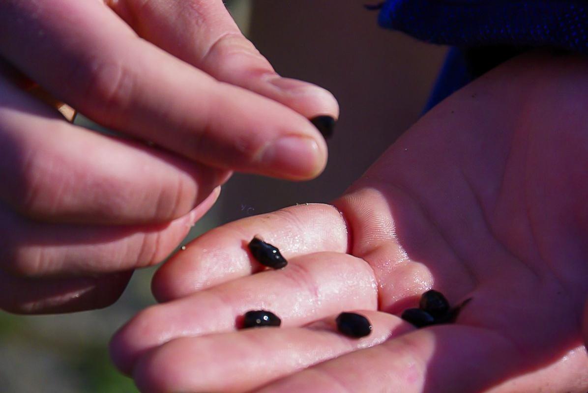 Schwarze Samen liegen in einer Hand, während eine andere Hand einen Samen anhebt