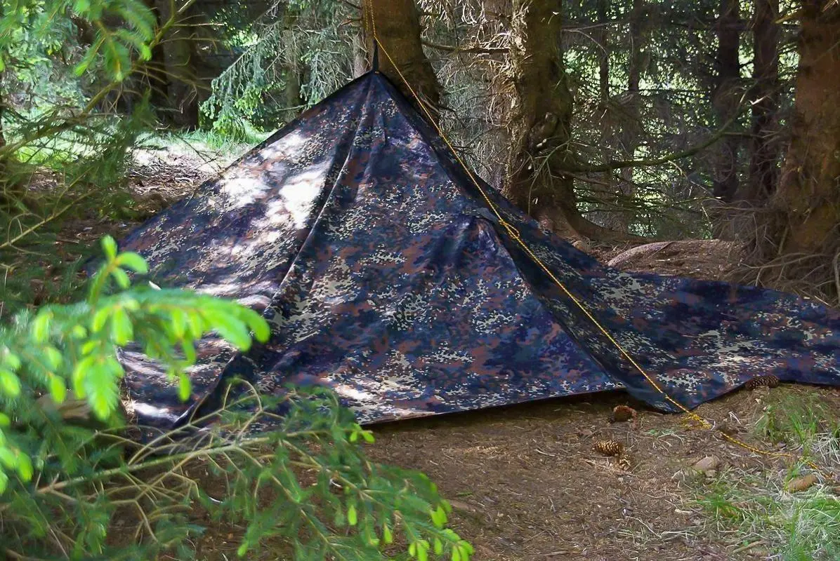 Tarp-Notunterkunft aus camouflagefarbenem Material zwischen Bäumen auf dem Boden