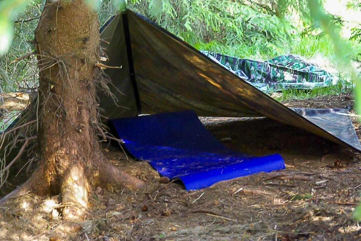 Tarp-Notunterkunft unter einem Baum mit blauer Unterlage auf dem Boden