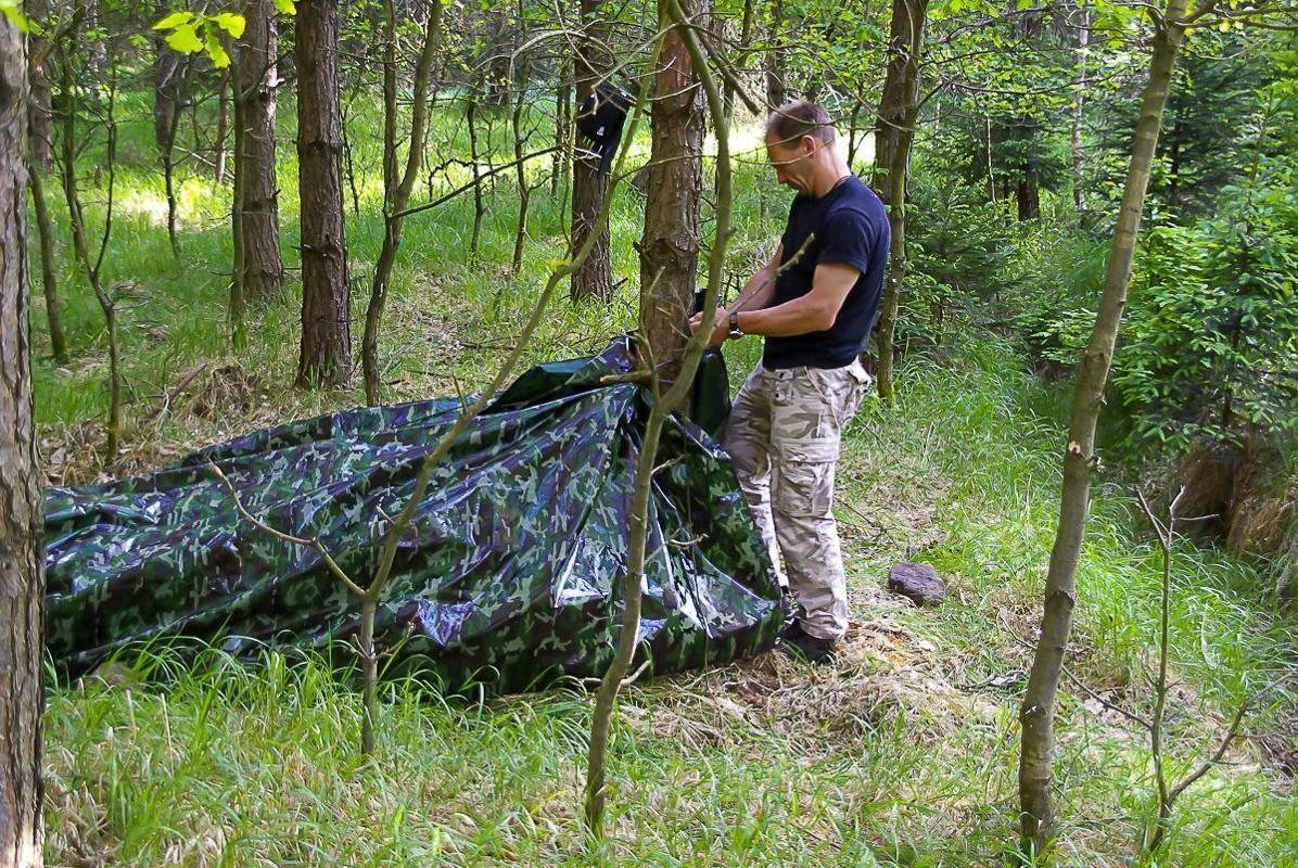 Tarp-Notunterkunft wird zwischen Bäumen aufgestellt und mit Abspannschnur gesichert
