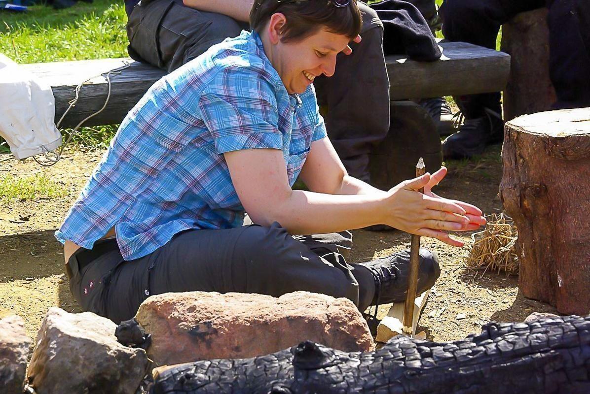 Gruppe um ein Feuer versammelt, Holz wird vorbereitet und Zunder angezündet