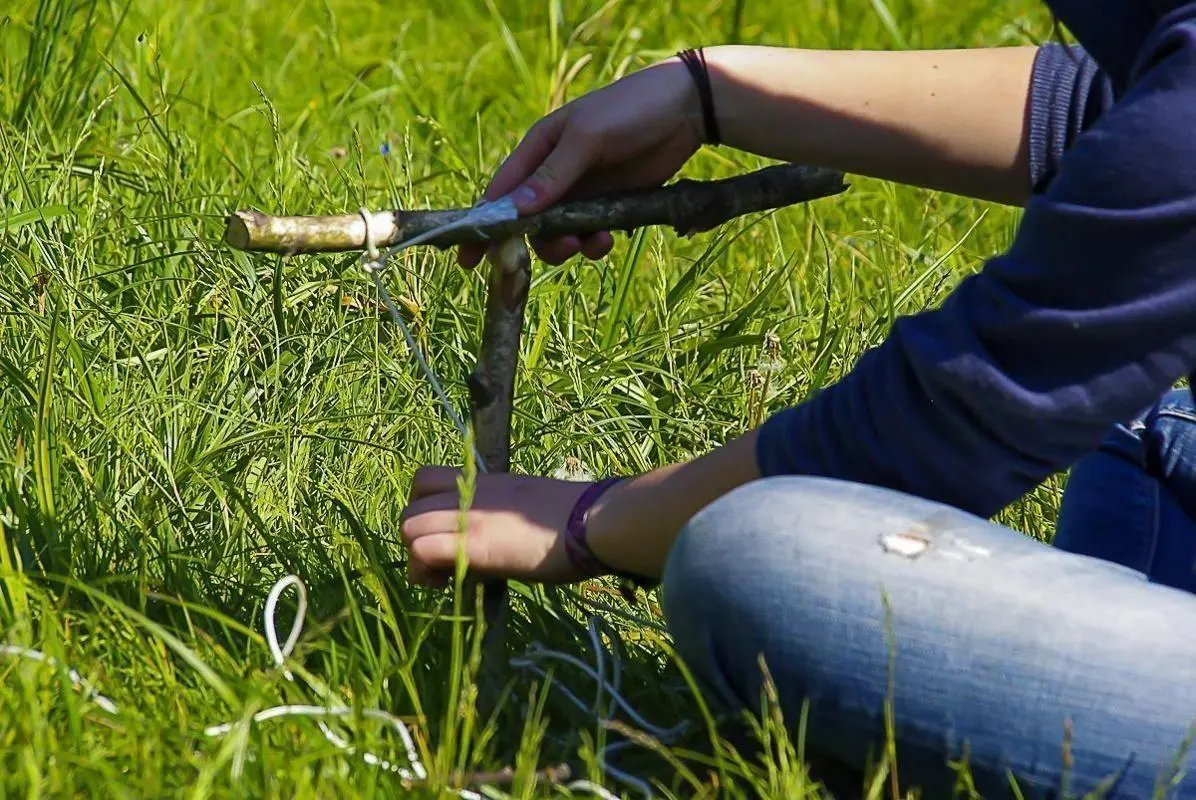 Zwei Personen bauen eine Schlagfalle (Figure-Four) aus Holzstücken im Gras