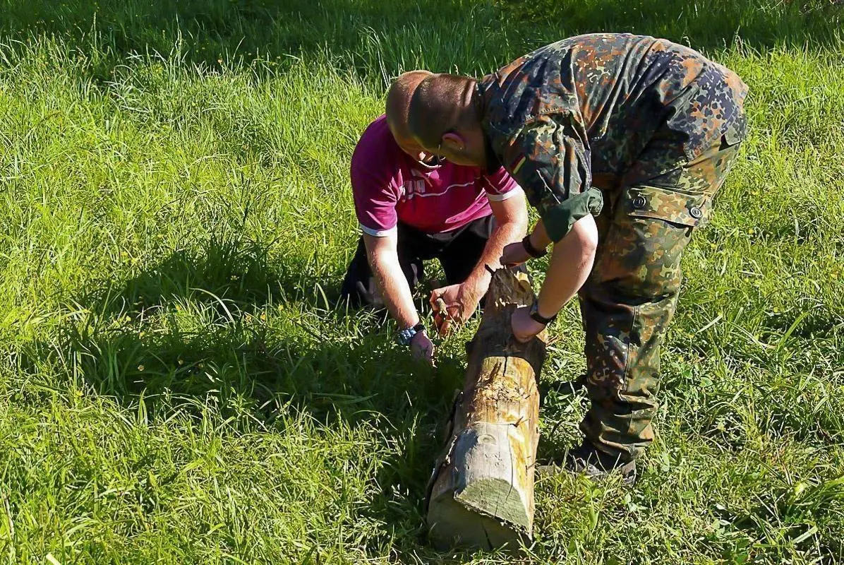 Zwei Personen arbeiten an einem Holzstück im Gras