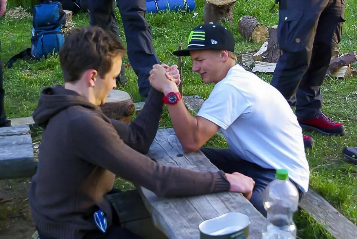 Zwei Personen führen ein Armdrücken auf einem Holztisch durch
