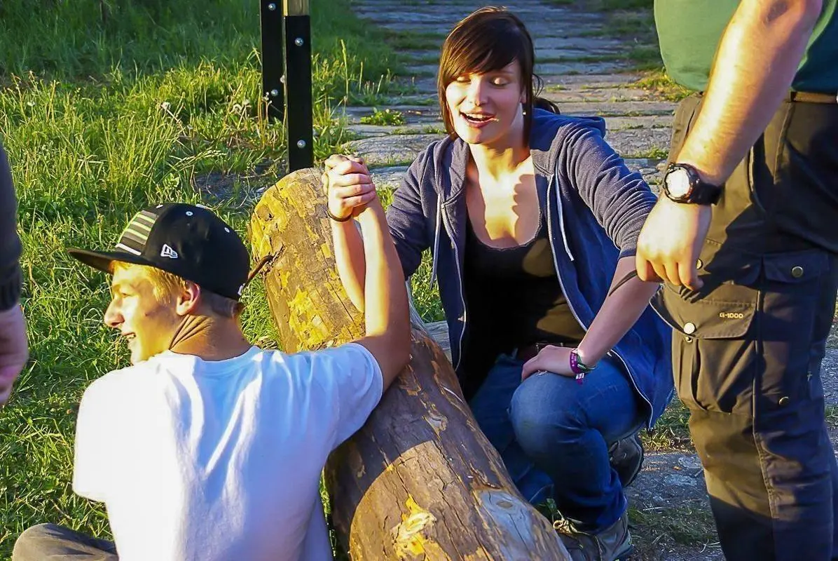 Zwei Personen halten sich an einem Holzstamm fest, während eine dritte Person zuschaut