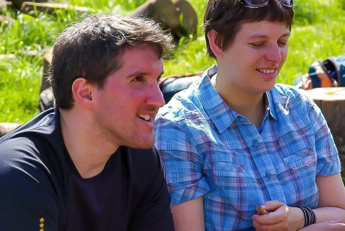 Zwei Personen sitzen nebeneinander auf einem Baumstamm und unterhalten sich