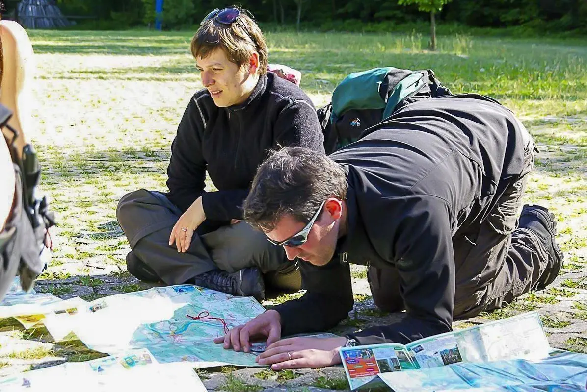 Zwei Personen studieren Karten auf dem Boden in einer grünen Umgebung