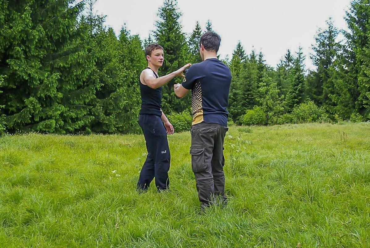 Zwei Personen üben eine Technik im hohen Gras unter Bäumen
