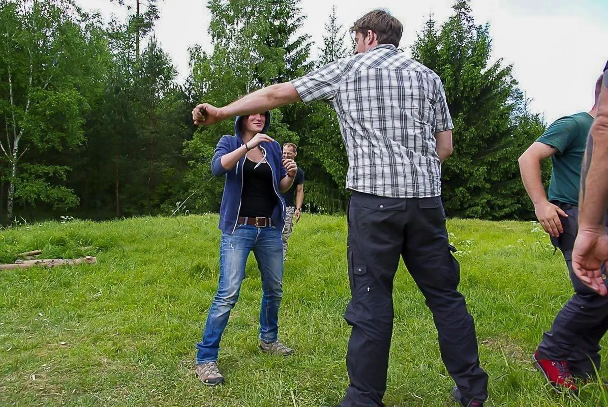 Zwei Personen üben eine Technik zur Selbstverteidigung auf einer Wiese