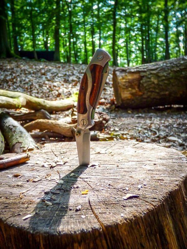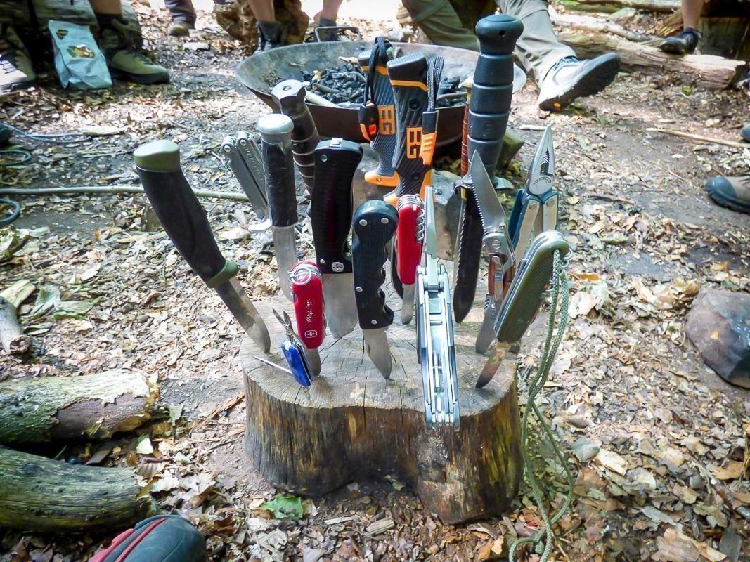 Verschiedene Messer und Werkzeuge stehen auf einem Baumstumpf im Wald