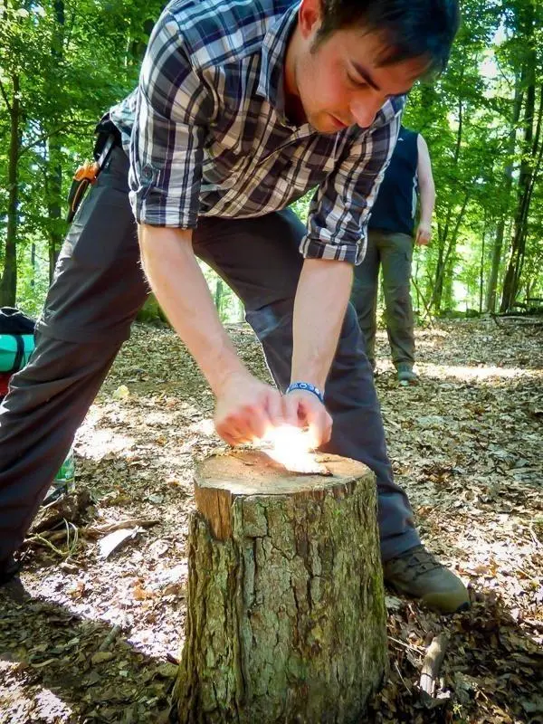Feuerstahl erzeugt Funken auf Zunder auf einem Baumstumpf im Wald