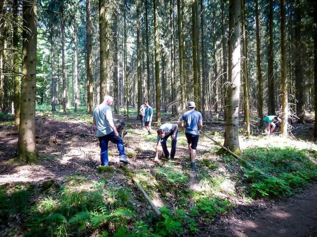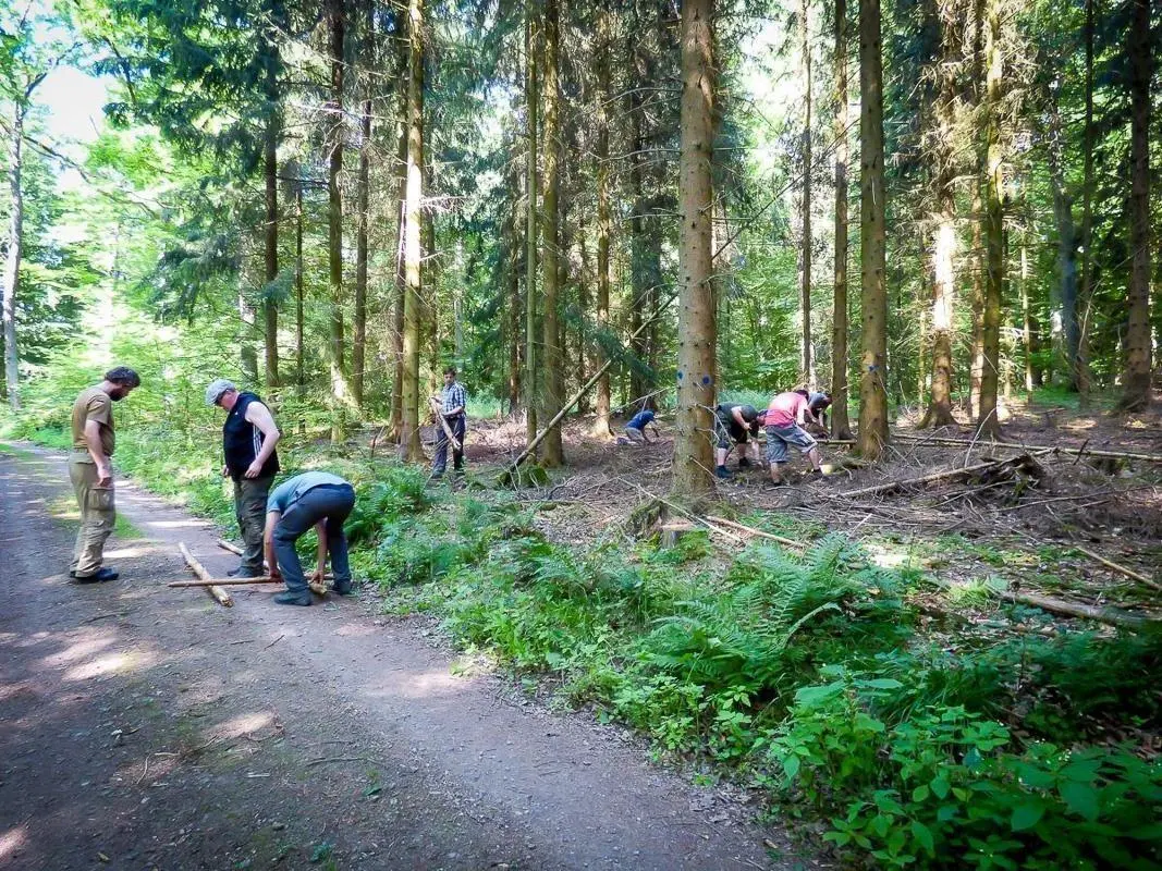 Gruppe arbeitet im Wald, entfernt Äste und räumt den Boden auf